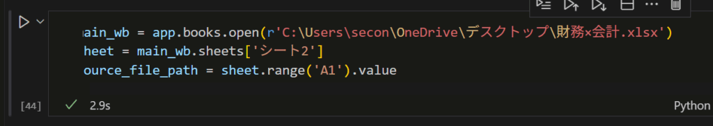 main_wb = app.books.open(r‘C:\Users\secon\OneDrive\デスクトップ\財務×会計.xlsm’)