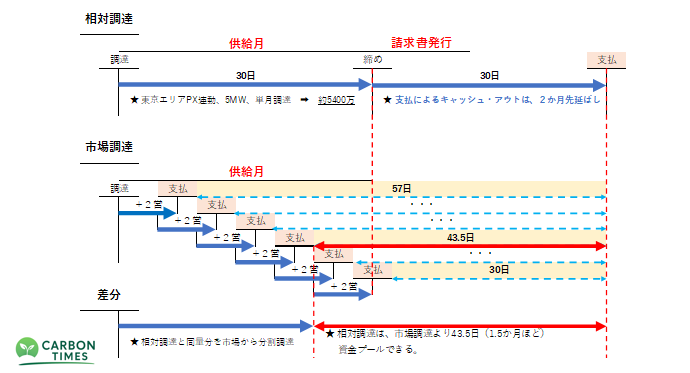通常、相対調達では供給月の翌月末払い。市場調達の場合は、調達から2営業日後に清算される仕組みです。両社のキャッシュ・アウトを比較すると、相対調達は市場調達に比べて、約1.5か月間(43.5日間)資金をプールすることができます。
