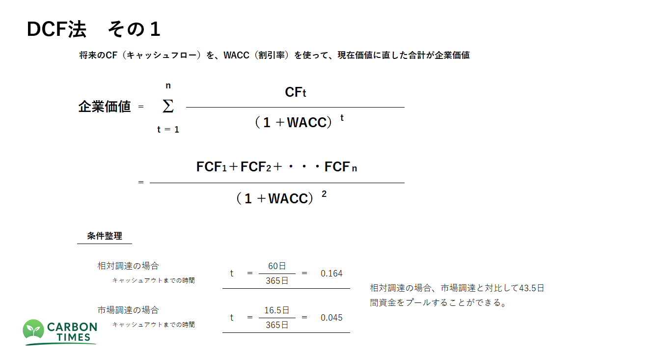 DCF法とは、本来企業価値を評価するための手法です。将来CF(キャッシュフロー)をWACC(割引率)で現在価値に割り戻す手法です。