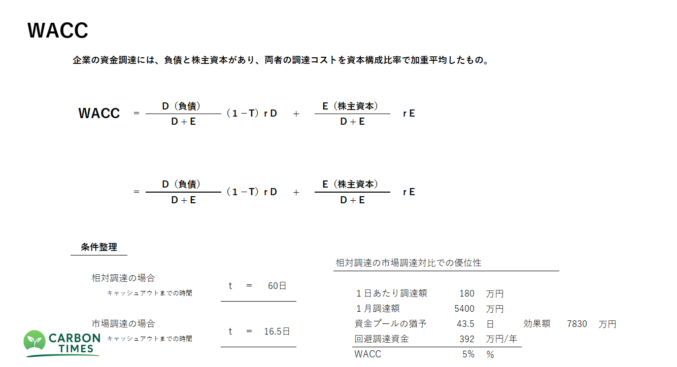 上記の通り、市場調達(調達の2日後に清算)の代わりに相対調達を実施した場合、43.5日間資金が手元に残ります。金額に換算すると約7830万円。こちらにWACC(資本コスト)を掛けることで利子負担を節約するのと同じ効果があるというわけです。