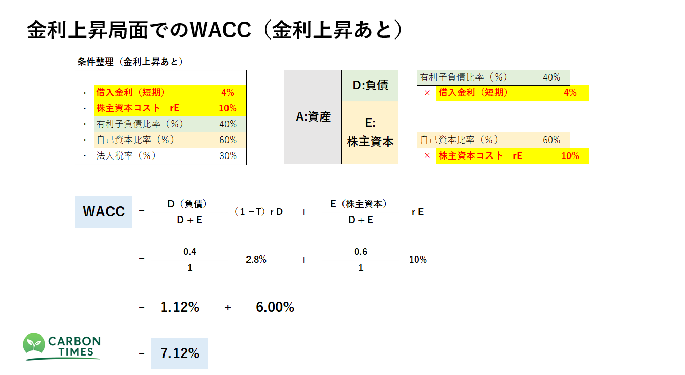 WACC(外部資金調達コスト)は、7.12%となり、5.08%から2.04%の上昇となります。